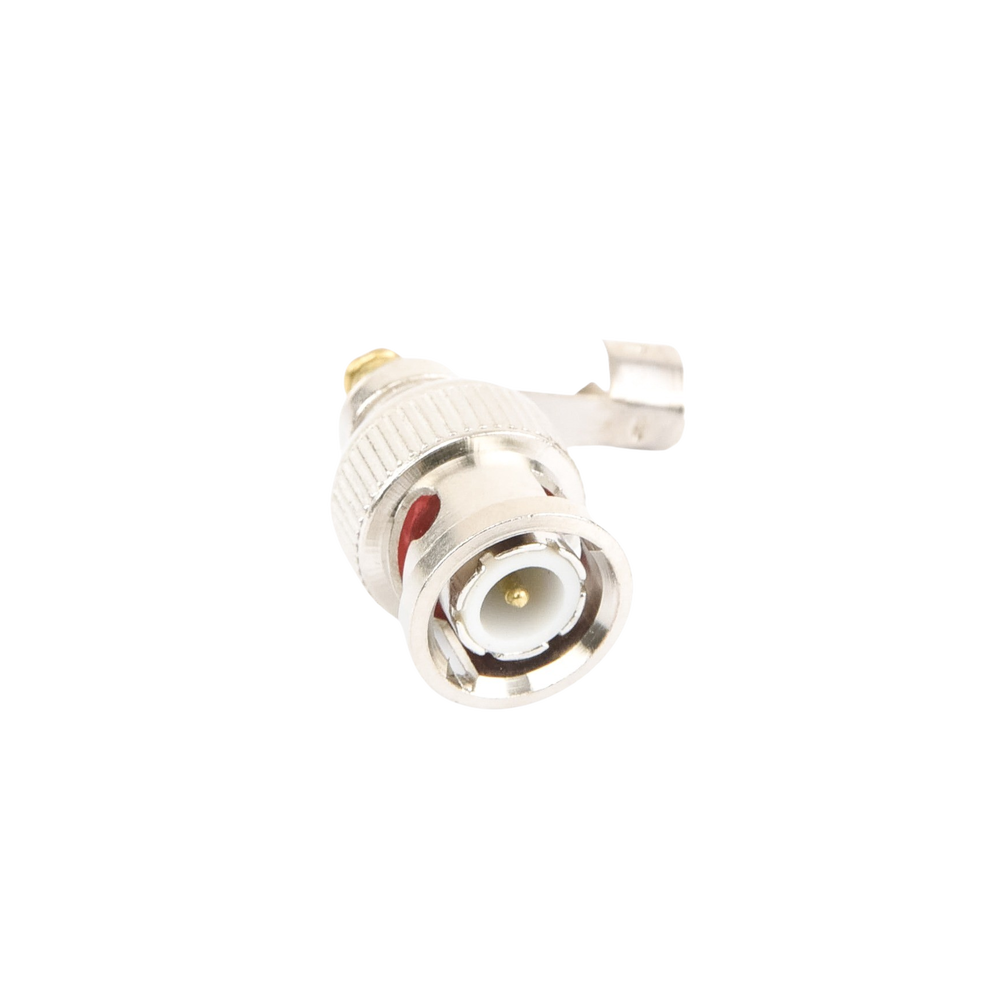 Conector BNC macho en 75 Ohm, para cable coaxial RG-59 / Con base de alivio negra de PVC, Níquel/ Oro/ PTFE.