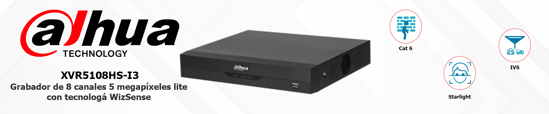 DAHUA XVR5108HS-I3 – DVR de 8 canales 5MP Lite, WizSense con IA, H.265+, 8 Canales Analogos + 4 IP o hasta 12 canales IP, 1 canal de reconocimiento facial, SMD Plus, 1 canal de protección perimetral y 1 bahía HDD #5MP