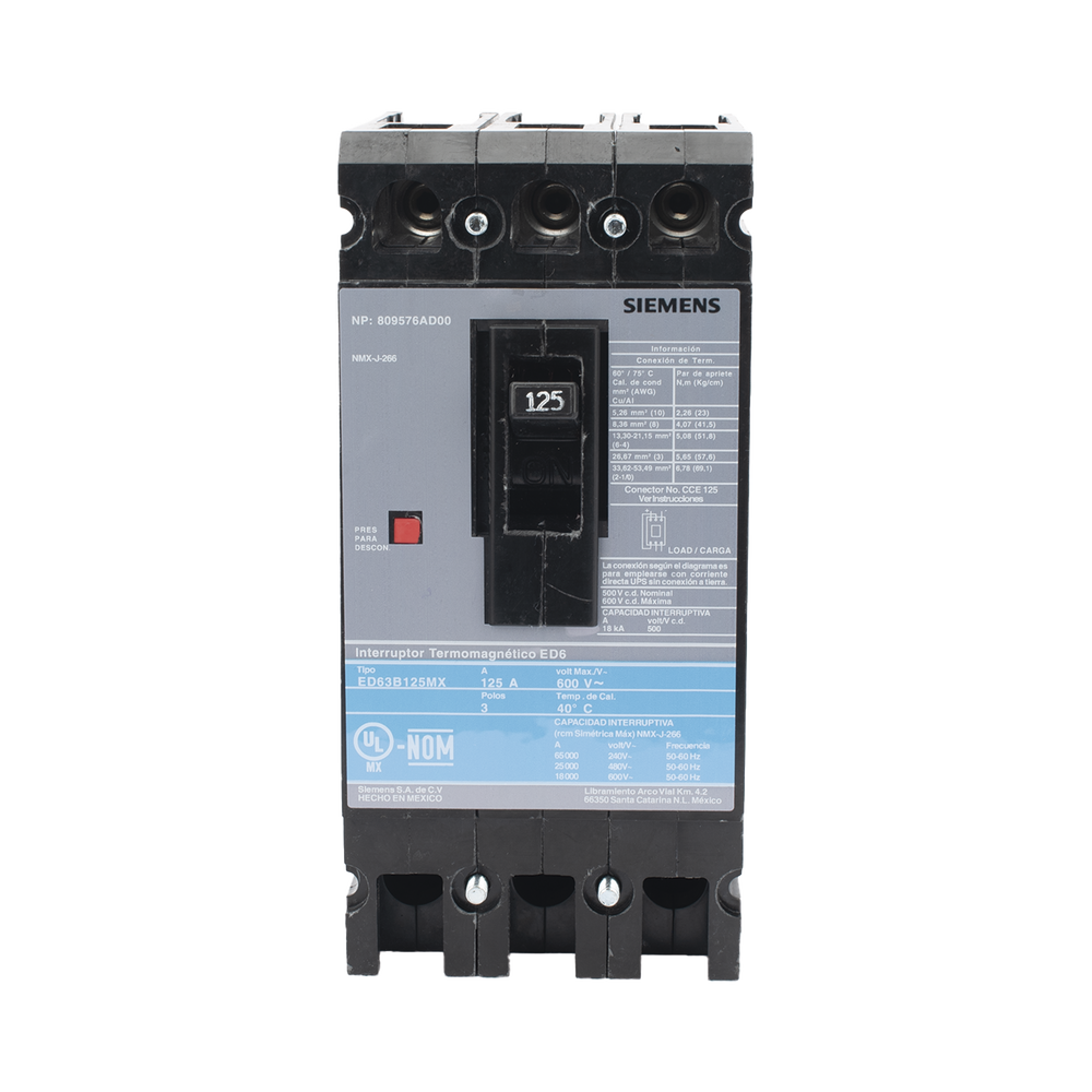 Interruptor Termomagnético ED6 600V 3X125A, Sin zapatas principales.
