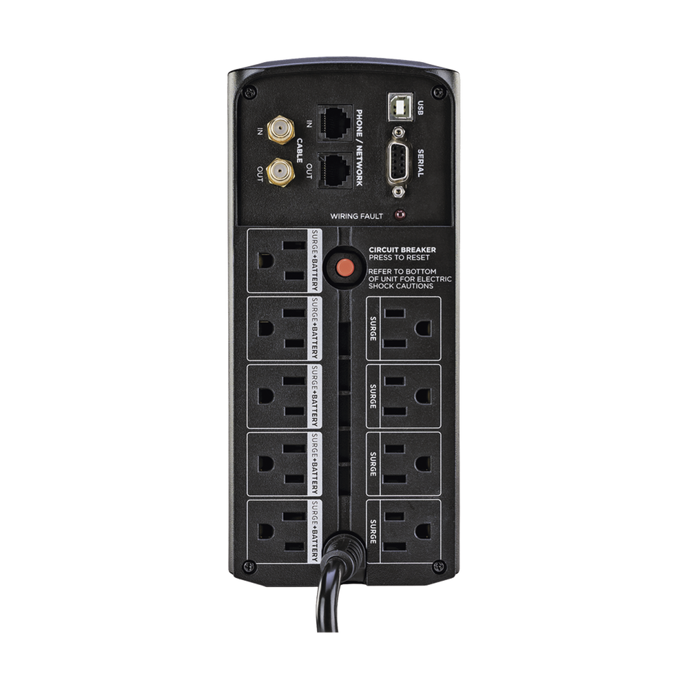 El UPS presenta una pantalla LCD multifunción para mostrar información sobre la potencia y las condiciones de la batería. La protección de línea telefónica incluida puede proteger los teléfonos contra sobretensiones y picos. También es compatible con PowerPanel® Power Management Software para realizar un apagado ordenado de la PC.